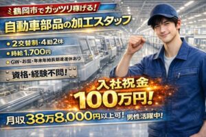 | ・時給 1,700円 / 月収 38.8万円以上可 ・入社祝金 100万円プレゼント! ・2交替/年間休日141日/長期休暇あり ・製造未経験OK・研修充実 |