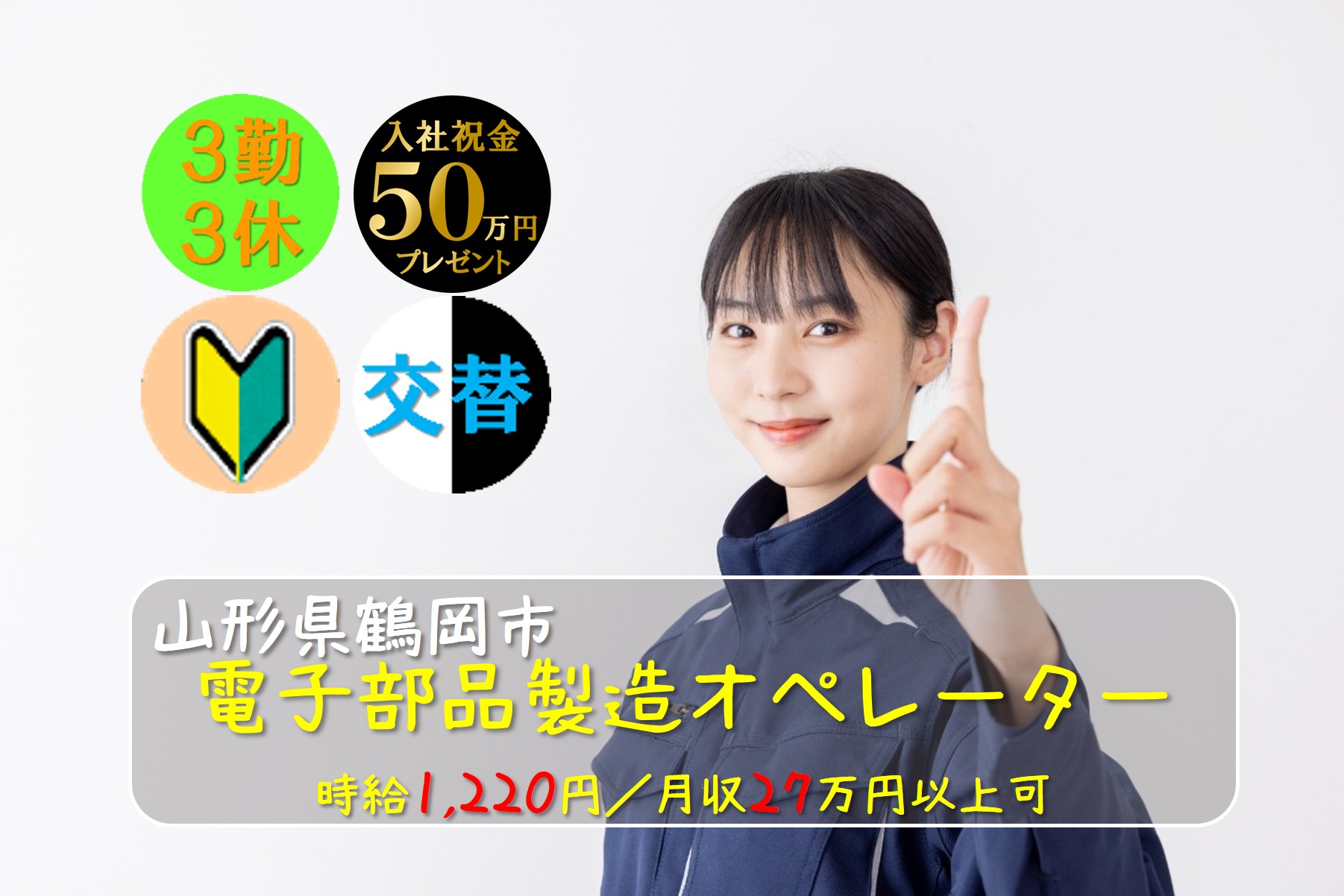 | ・小型電子部品の製造に係るお仕事 ・入社祝金50万円プレゼント! ・時給 1,220円/月収 27万~以上可 ・年間休日184日 1ヶ月15日のお仕事のため、月の半分がお休みでプライベートが充実できます ・2交替 ・3勤3休(3日勤務、3日休みのサイクル) ・資格経験不問からチャレンジできる製造のお仕事 ・冷暖房完備のキレイな工場 |