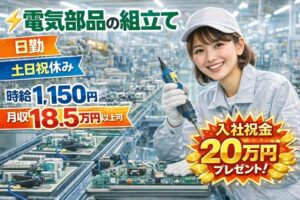 | ・電気部品やモーターの組立て ・入社祝金20万円プレゼント! ・時給 1,150円/月収 18.5万円以上可 ・残業少なめ ・人気の日勤 ・土日祝休み(ほか、年末年始・GW・夏季休暇などの長期休暇あり) ・資格経験不問からチャレンジできる製造のお仕事 |