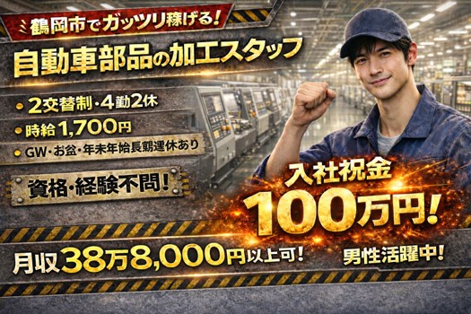 【高収入×未経験歓迎】時給1700円/入社祝金100万円/カンタン機械操作(鶴岡市)