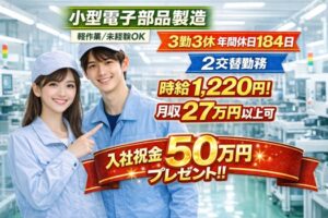![]() ≫ 詳細を見る ≪ NEW! 時給 1,200円/月収 20万円以上可 入社祝金 5万円プレゼント! 日勤・土日祝休み(月平均20日稼働) GW・夏季休暇・年末年始など長期連休有り フォークリフト免許お持ちの方 製造業未経験でもチャレンジできるお仕事です 求人NO.0046 |